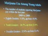 In one slide labeled “Marijuana Use Among Young Adults” the percentage of kids in eighth, tenth and twelfth grades who reported using marijuana is on the rise. Among high school seniors questioned, 66 percent said that they had used alcohol and 33 percent said they had used marijuana in the last 12 months.