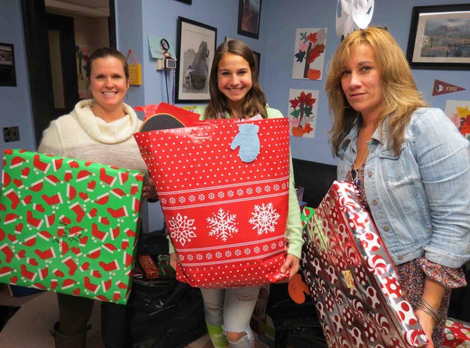 Photo courtesy of the Port Jefferson School District: Port Jefferson school social worker Kristin Britt, high school student Corinne Scannell and school speech therapist Stacia Schoen pack up gifts to be delivered to eight local families.