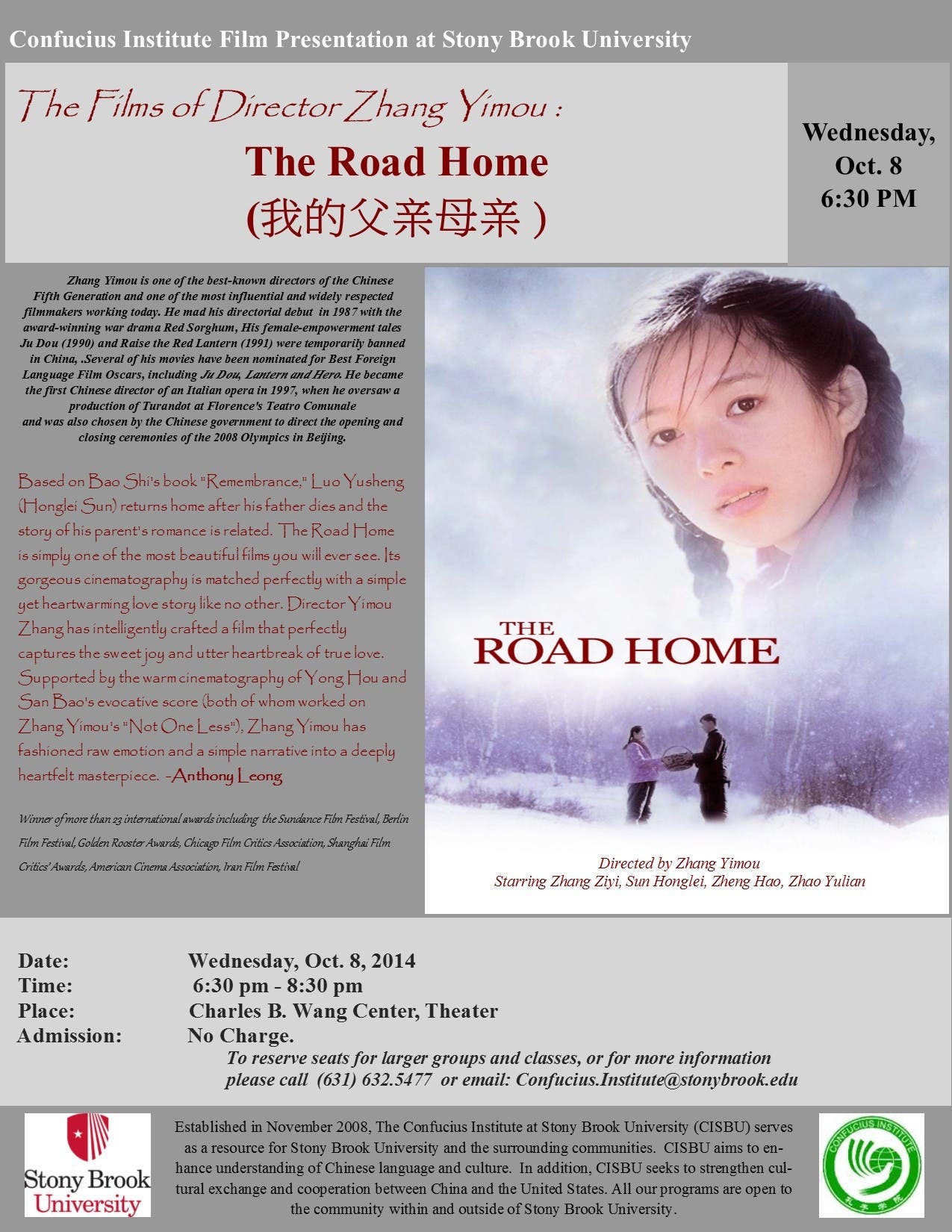 "TONIGHT!!" Free Film "The Road Home", October 8, Wednesday, Wang Center Theater - Confucius Institute at Stony Brook University