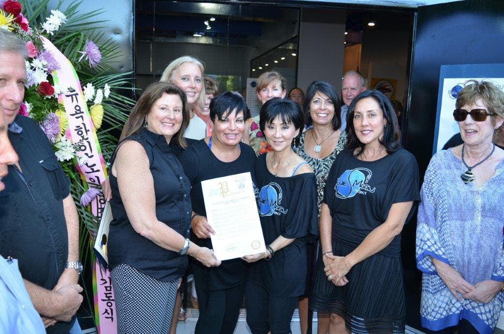 Photo: Barbara Donno (Senator Jack Martins office), Nassau County Legislator Delia DeRiggi-Whitton, owners Michele Arnold and Helen Leib, Town Councilwoman Dina DeGiorgio, Donna Bruno, and Catherine O’Neill (Chamber of Commerce and Sullivan’s Quay.)