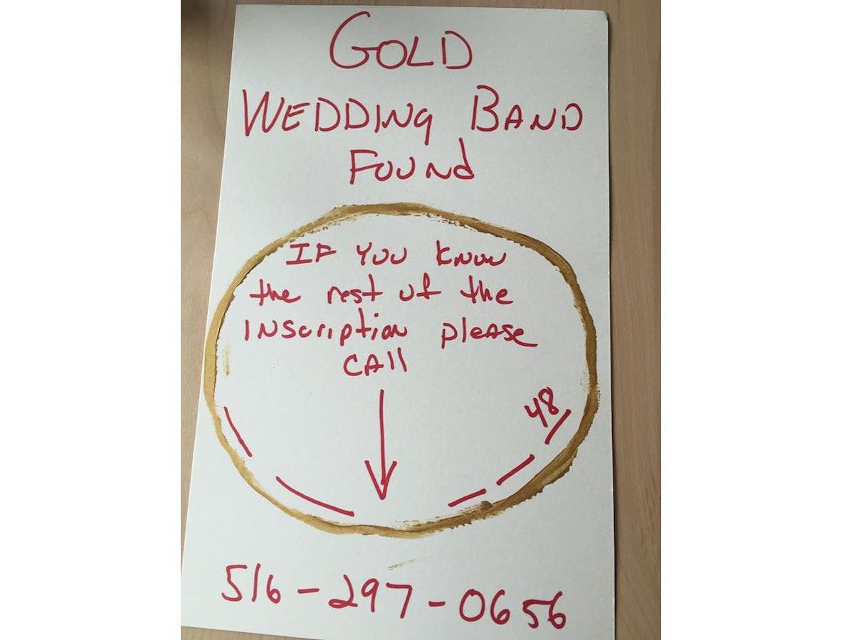 “Gold wedding band found. If you know the rest of the inscription, __ __ _ _ 48, please call 516-297-0656.”