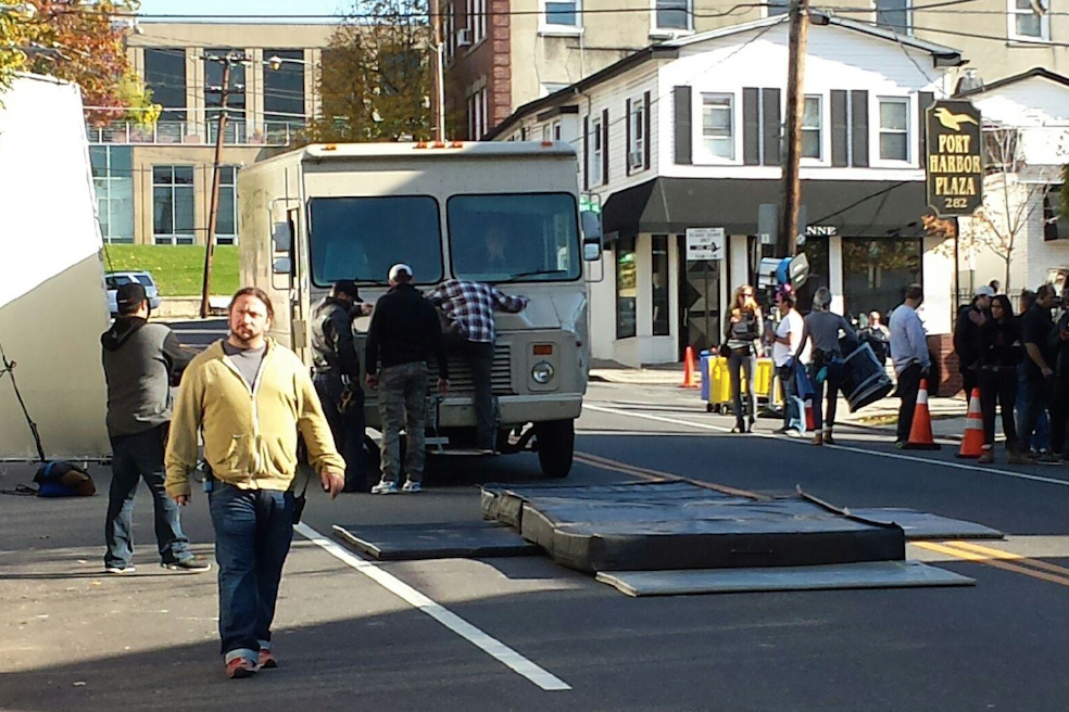 Film crews on Port Washington’s Lower Main Street. Credit: Vivian Moy