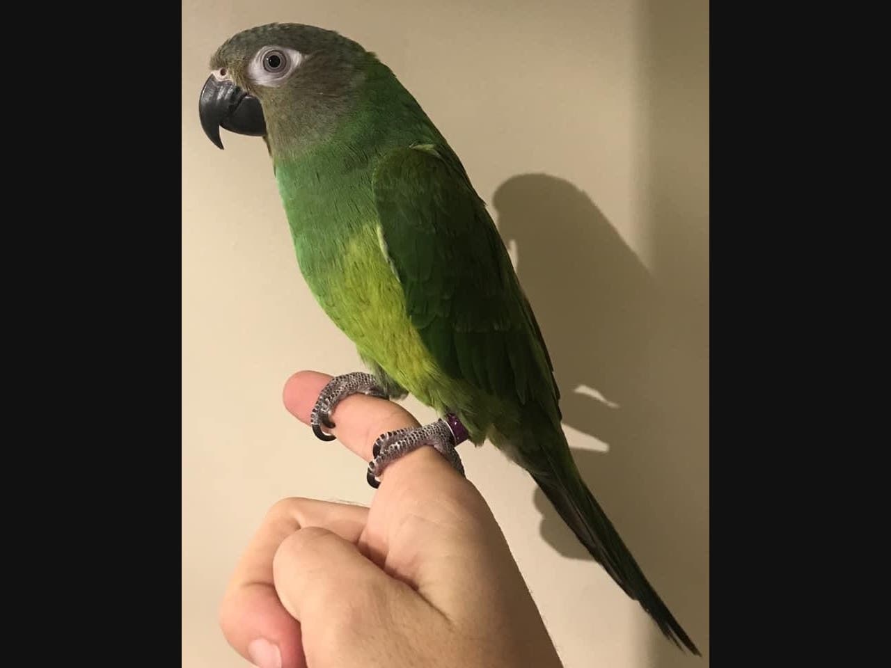 Our pet parrot flew away Friday 6/26 around 6pm in Manorhaven (Port Washington), NY in Nassau County Long Island. He is a dusky conure, all green with a grey head, with a distinctive long skinny tail and a silver ring around his ankle. He was flying around the tops of different trees in the area, but we haven’t heard or seen any signs of him since Saturday morning. We last spotted him on Barker’s Point Road behind the cul-de-sac of Hickory Road. His name is Dusty and is responsive when his name is called. He has a loud screeching call. If you happen to hear or see him, please call Keri at 516-459-3014 so we can hopefully bring him back home. Any help would be greatly appreciated!