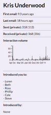Immersion can also objectively respond to your Mother's "Why don't you ever write?" complaint. When used to analyze a single contact, Immersion produces a graph of interactions by year. Also depicted in the screenshots is a plot of the interactions by year.