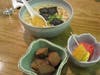 My dining companion ordered the $10 special advertised at the door. It turned out to be the absolute best lunch deal in the restaurant, and possibly the best deal in all of town. For her $10, she was served first the salad with the ginger dressing, and then a large bowl of some type of udon (noodle) soup. Next came a beautifully arranged sushi combination plate, accompanied by two small bowls — one containing three or four chunks of assorted fruit, and a second bowl containing some squares of brown-grey objects in a brown-grey sauce.