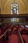 In 2012, Brown Memorial received recognition for their stained-glass window, The Pilgrims, through its participation in AMEX’s Partners in Preservation Grant program where BMBC was awarded a grant to restore the window to its former grandeur. In the style of Louis Comfort Tiffany the window exhibits the use of sculptural glass of varied thickness for clothing and drapery, painted faces and hands for accuracy in anatomical features, and plating of layers of opalescent and colored glass for subtle effects. Standing at 40 feet high and 15 feet wide, The Pilgrims depicts the struggles of the Pilgrim religious leaders, including abolitionists and workers of the Underground Railroad - a nod to Clinton Hill’s past as a hotbed of abolitionist activity. At the balcony level, The Pilgrims window features a large central panel depicting two Pilgrims approaching an angel. Flanking the figures are two side panels with text from Exodus 23:20: “Behold, I send an angel before thee to keep thee in the way and to bring thee into the place I have prepared.” (Photography by Trix Rosen)