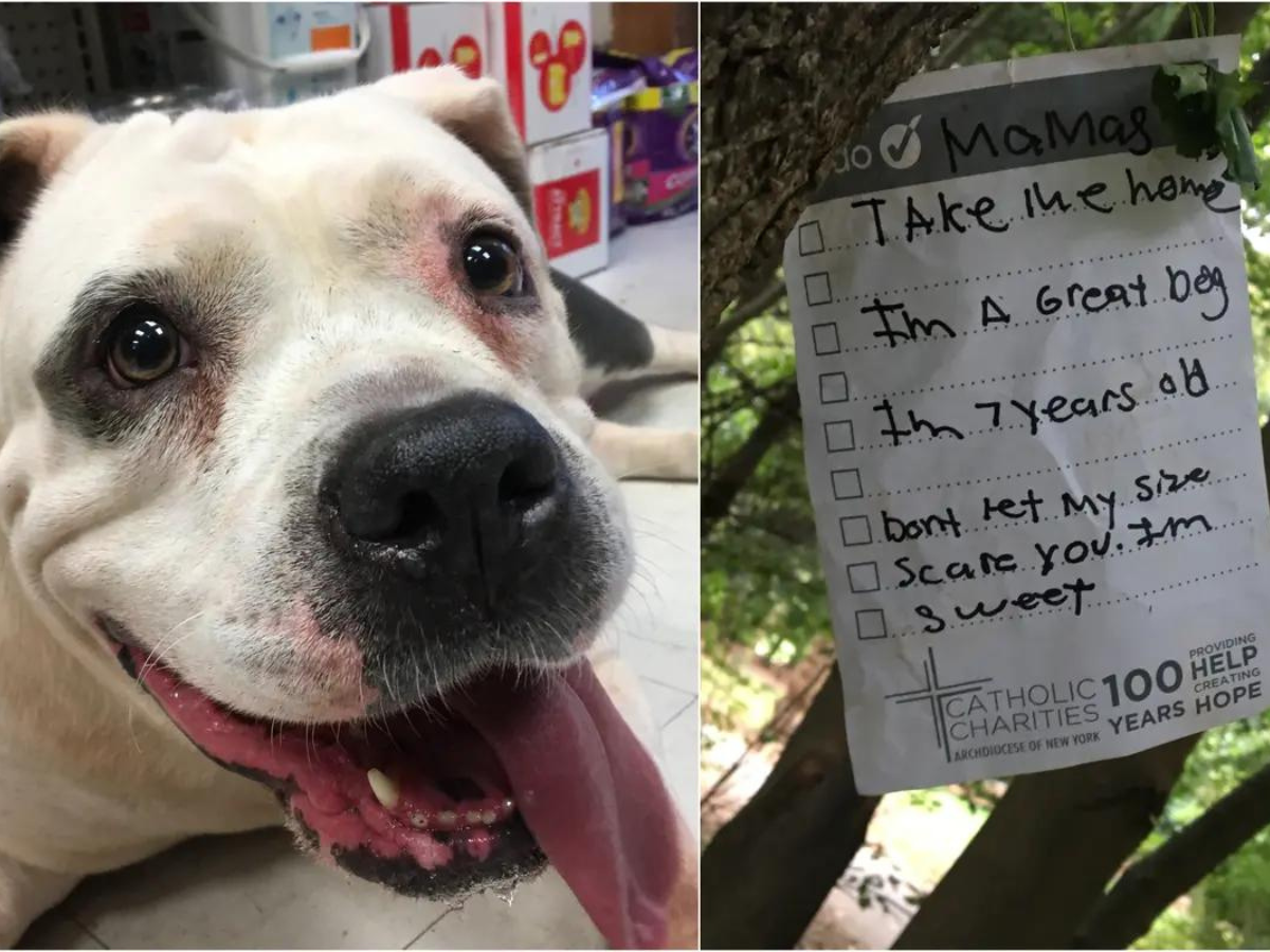 A "sweet and smiling" pit bull was left tied to a Prospect Park tree by the boathouse along with a note that read, "Take me home ...I'm a great dog, don't let my size scare you. I'm sweet."