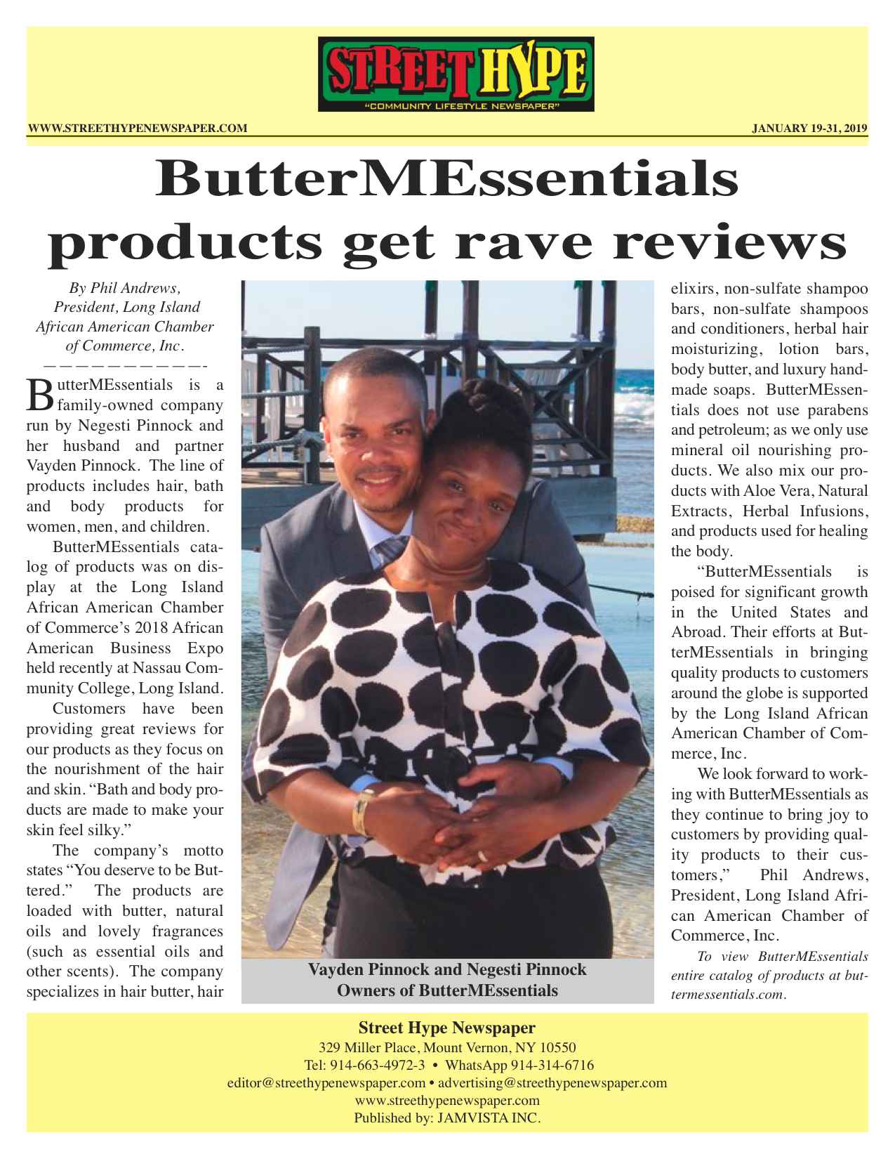 New York, New York - ButterMEssentials a Brooklyn-based company founded by Mrs. Negesti Pinnock and her husband and partner Vayden Pinock. ButterMEsentials line of products includes hair, bath, body and products for women, men and children. ButtterMEssentials products are loaded with butter, natural oils and lovely fragrances (such as essential oils and other fragrances).