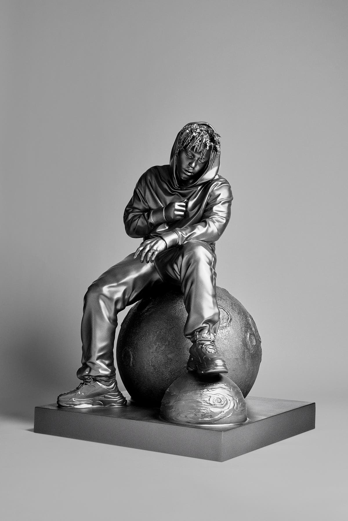 The statue of Juice WRLD, who sits atop a globe, is a nod to Atlas, the Greek Titan who carried the world on his shoulders. This image is meant to evoke the vulnerability in his music, officials said.