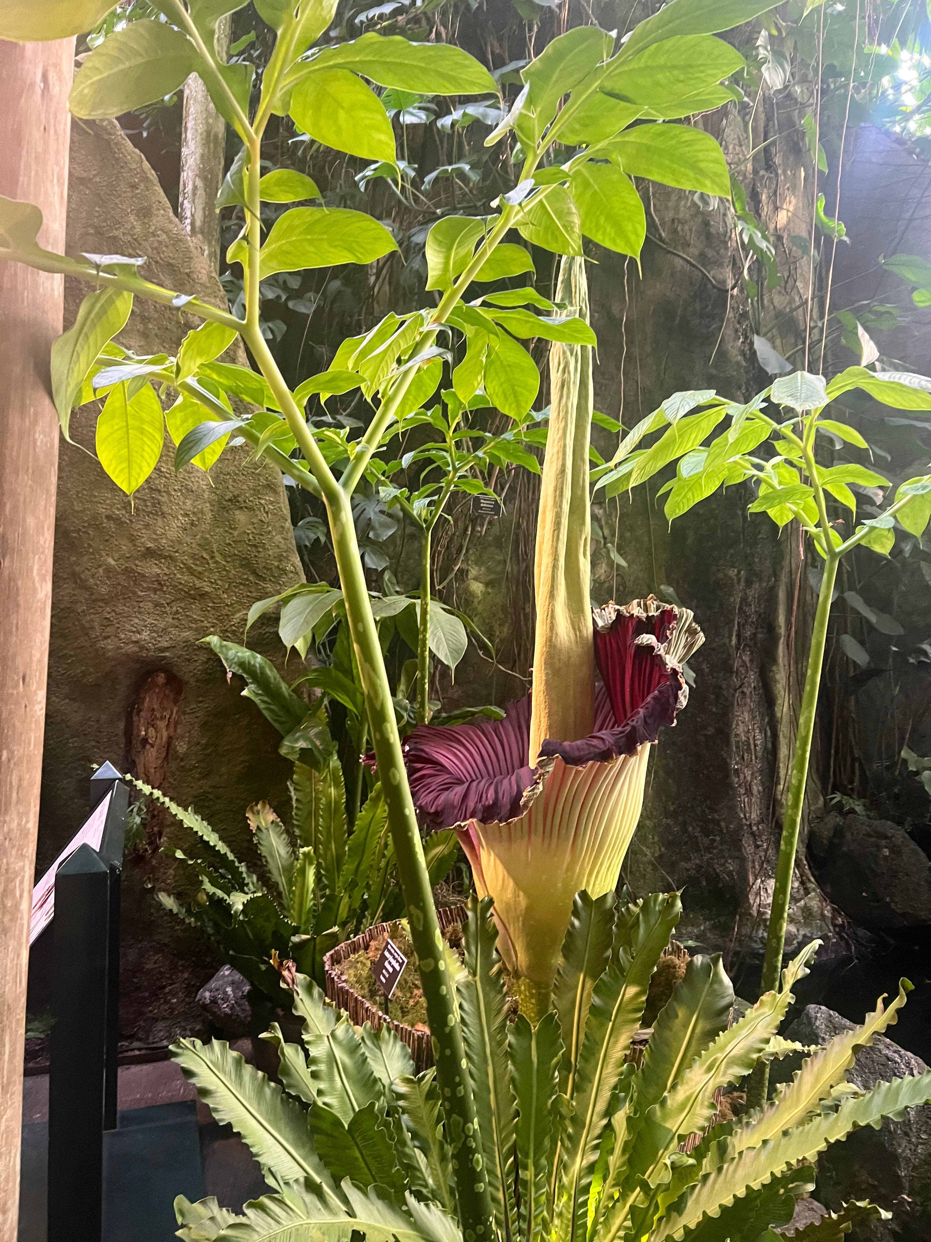 The enormous flower, Amorphophallus titanum or titan arum, is native to the island of Sumatra in western Indonesia, but New Yorkers were given a chance to see the flower at peak bloom in the gardens' Enid A. Haupt Conservatory Tuesday after it began to open its petals around 9 p.m. Monday.