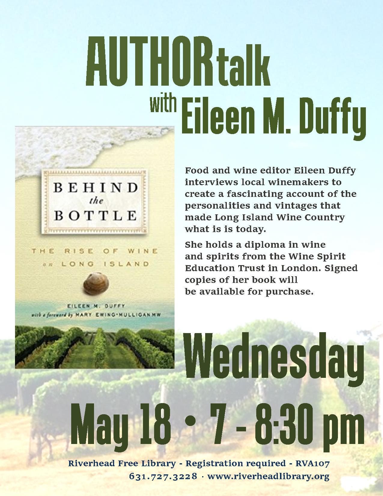 Food and wine editor Eileen Duffy interviews local winemakers to create a fascinating account of the personalities and the vintages that made Long Island Wine Country what it is today. Signed copies of her book will be available for purchase. Please register in person, by phone - 631.727.3228 or online at www.riverheadlibrary.org