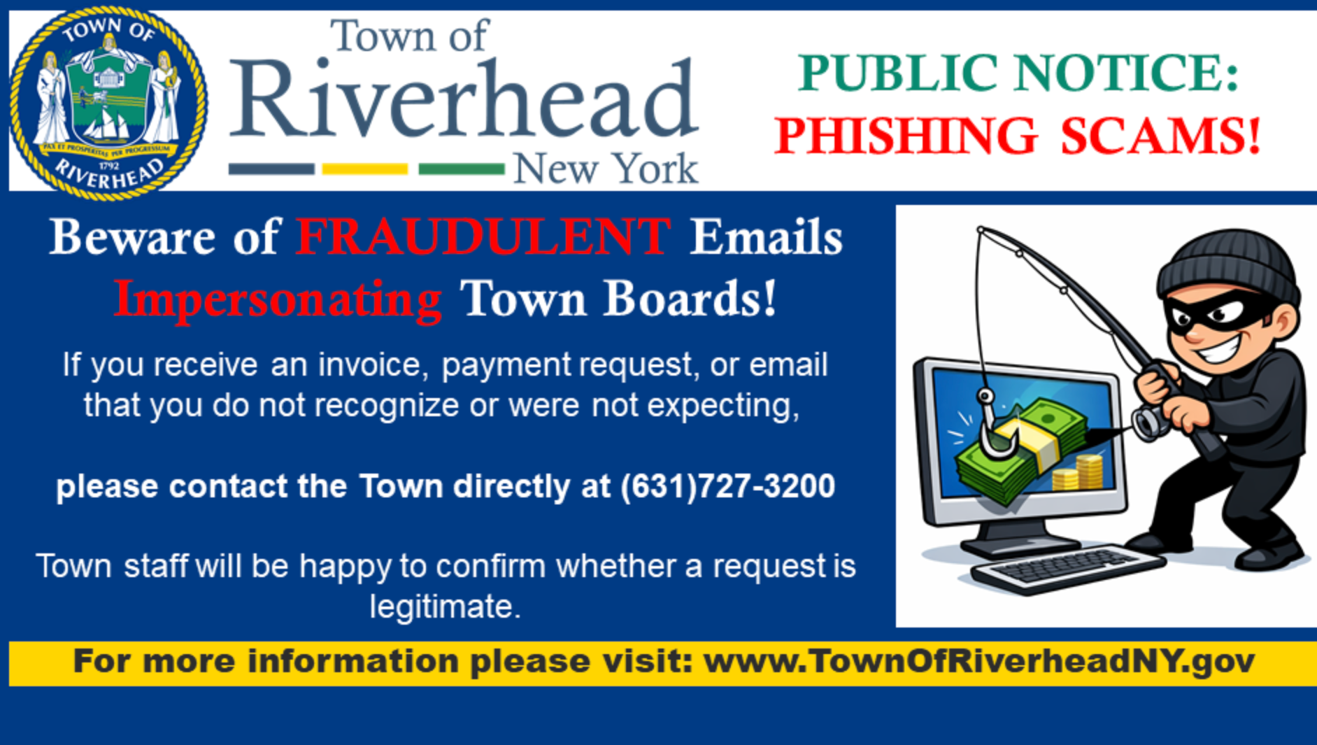 RIVERHEAD, NY — Fake emails are circulating, falsely claiming to be sent on behalf of Riverhead Town boards, including the zoning board of appeals and the planning board, officials said.