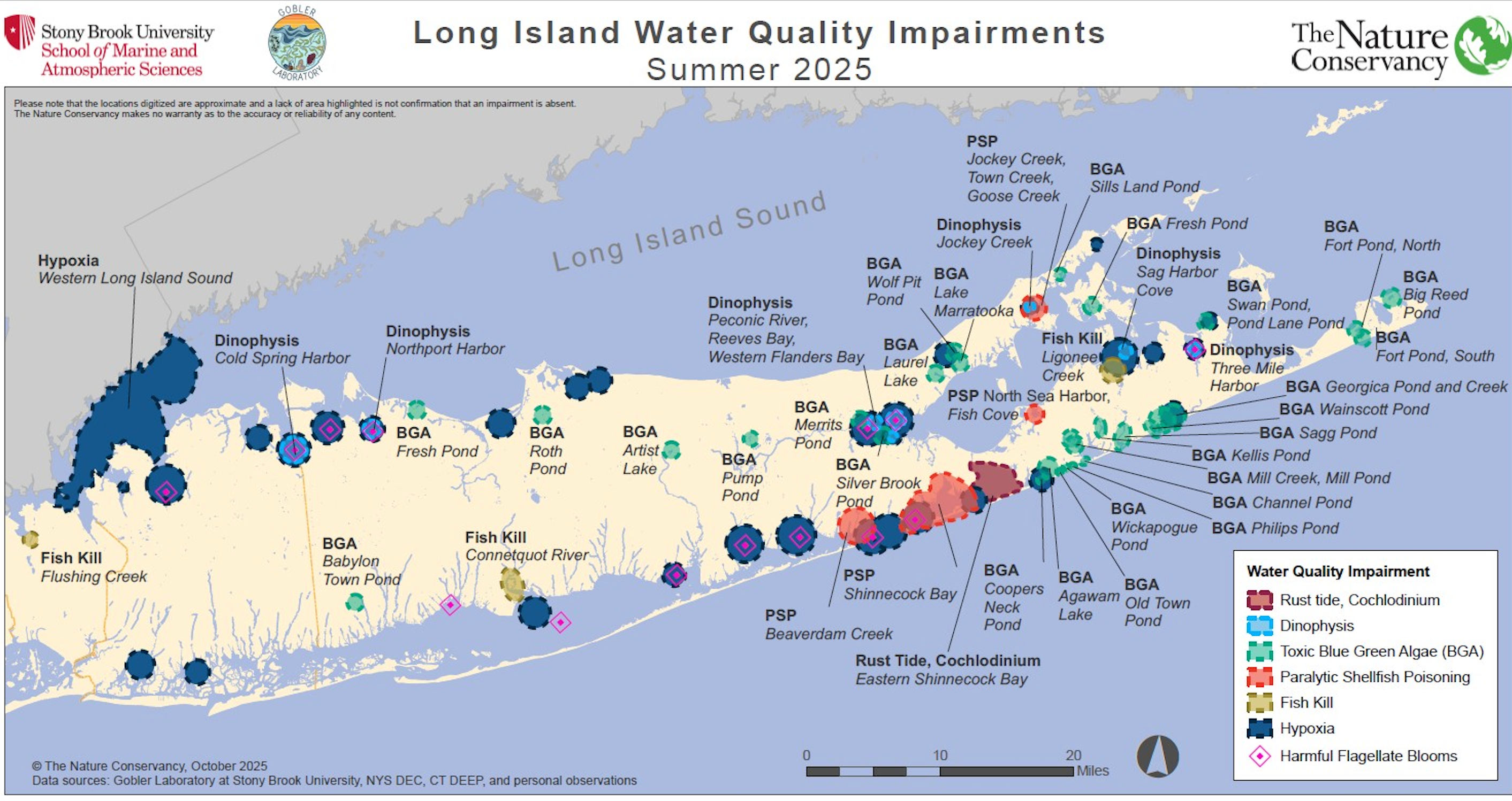 He presented a map of water quality impairment, which showed "dozens and dozens of locations" in estuaries, harbors bays and ponds across Long Island, where water quality is not meeting state and federal standards and where harmful algal blooms exist, Gobler said.