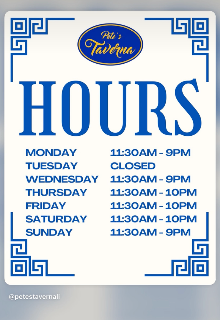 With the season starting, Pete's Taverna will be open Monday from 11:30 a.m. to 9 p.m., Wednesday from 11:30 a.m. to 9 p.m., Thursday through Saturday from 11:30 a.m. until 10 p.m., and Sunday from 11:30 a.m. until 9 p.m. Closed Tuesdays.