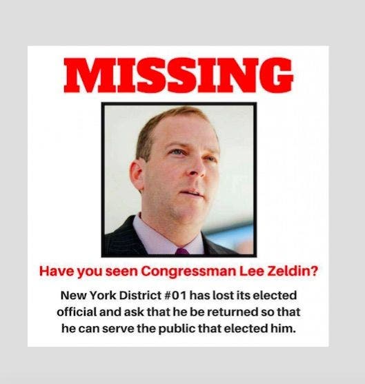 RIVERHEAD, NY — The signs look and read like "missing" pet and child posters: "Have you seen Congressman Lee Zeldin?" they read. "New York District 01 has lost its elected official and ask that he be returned so that he can serve the public that elected him."