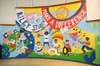 The very colorful mural covers the large curved wall of their newly remodeled cafeteria.