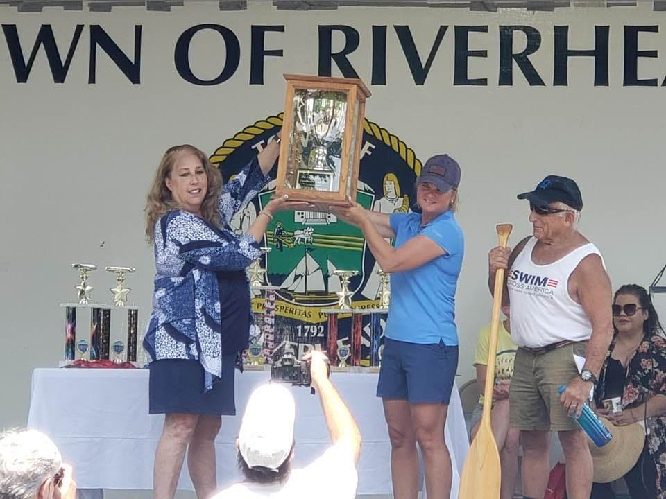 Unfortunately, Aguiar said, she is healing from a double ankle break, so she had her Deputy Supervisor Devon Higgins take helm of the vessel. Aguiar added: "Not used to losing, I engaged Jim Dreeben, who had the Peconic Paddler for 53 years, to help me engineer the boat."
