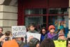 Waving signs and carrying letters in the cold morning rain, a crowd of more than 60 East End residents turned out Tuesday to bring their fears and concerns over Donald Trump to Congressman Lee Zeldin's office doorstep in Riverhead.