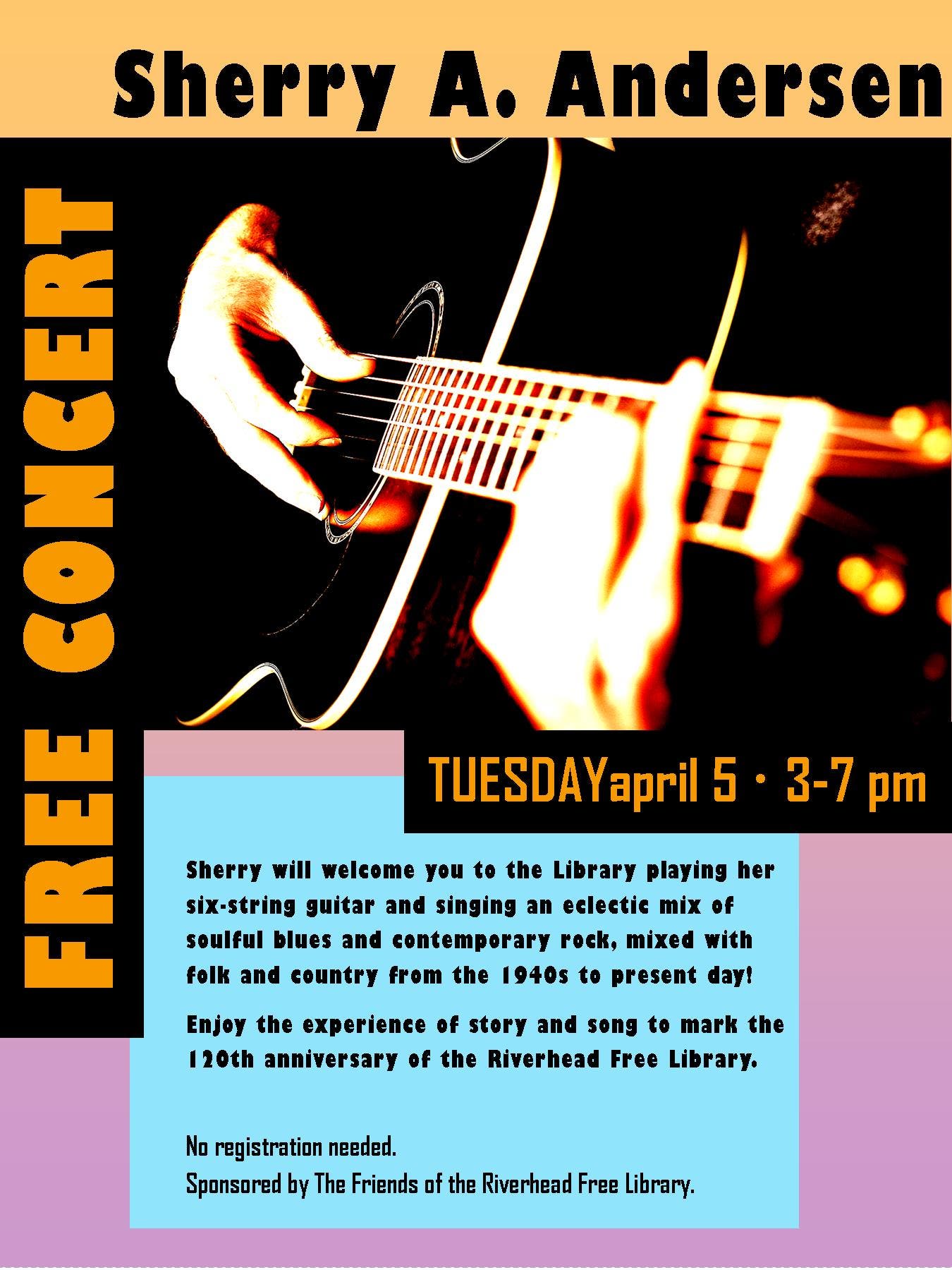 Enjoy the experience of story and song at this free concert, sponsored The Friends of the Riverhead Free Library, to mark the Library’s 120th anniversary. Sherry will be playing her six-string guitar and singing an eclectic mix of blues and rock, mixed with folk and country from the 1940s to present day. For more information, call 631.727.3228, ext. 100.