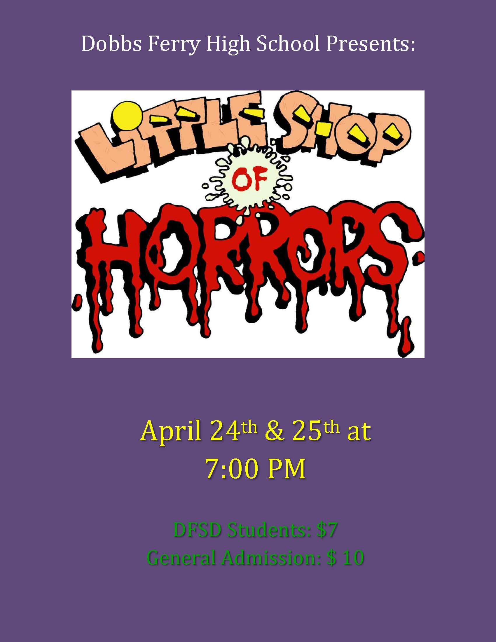 Dobbs Ferry High School students will present ”Little Shop of Horrors” this weekend, April 24 and 25 at 7 p.m. in the high school auditorium. General admission tickets are $10; $7 for students.