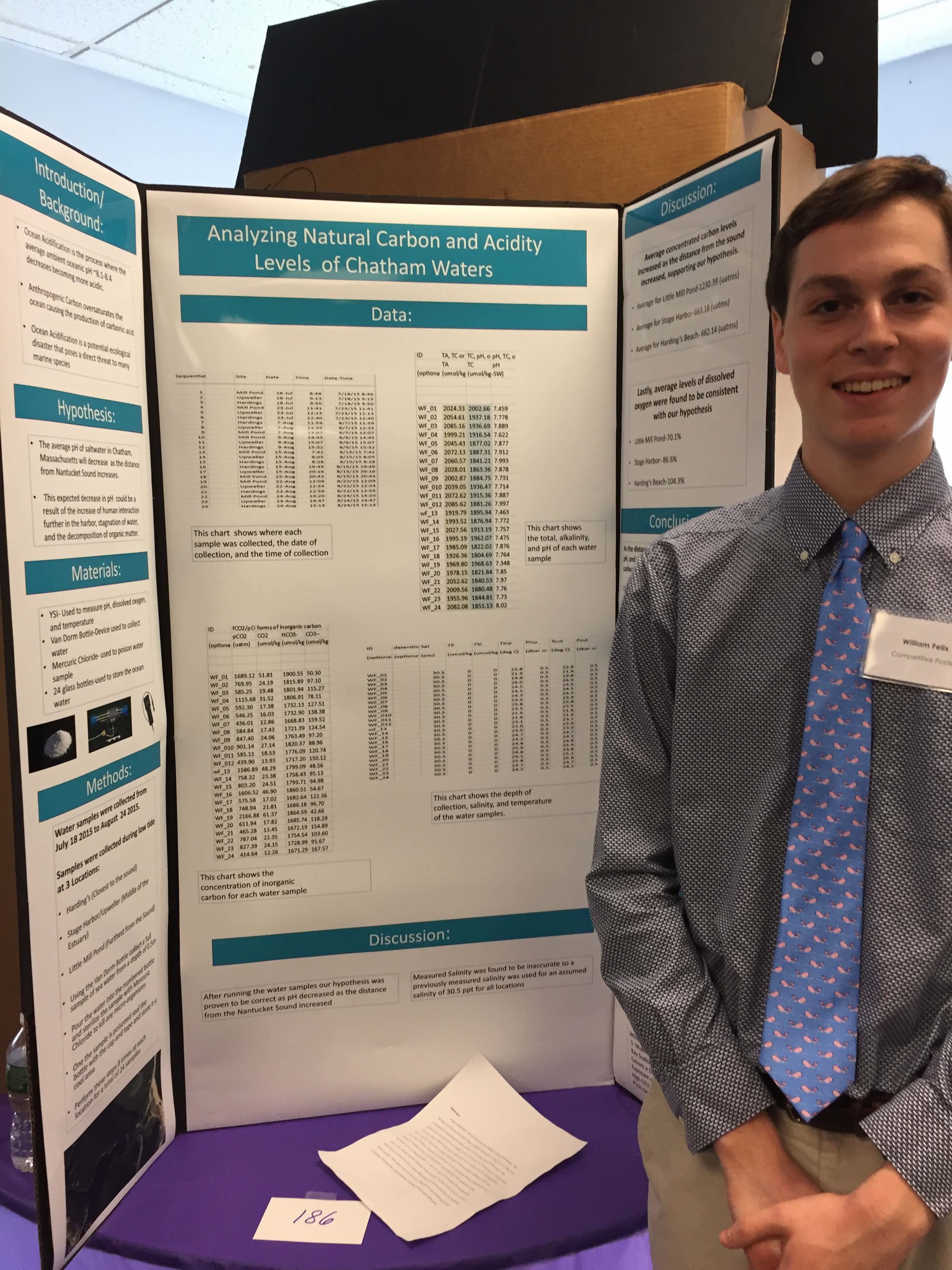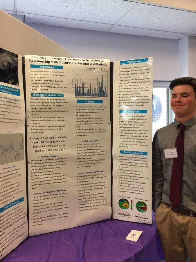 For his science research project, titled “Analyzing Natural Carbon and Acidity Levels in Chatham Waters,” Felix has been working with mentor Dr. Daniel McCorkle at the Woods Hole Oceanographic Institute in Cape Cod. Palmieri, whose science research project is titled “The Rise in Atlantic Hurricane Frequency and its Relationship with Natural Cycles and Oscillations,” has been working with mentor Joseph S. D’Aleo, a meteorologist at WeatherBELL.