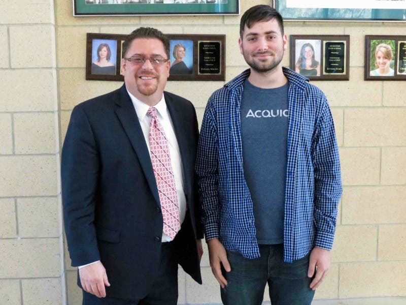 Photo: Irvington High School Principal David Cohen, left, congratulates senior Myles Novick, who was named a finalist in the 2015 National Merit Scholarship Program. Photo credit: Irvington School District