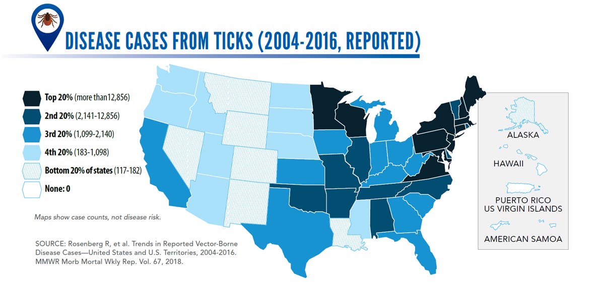 The CDC report cataloged the number of diseases contracted from bites from ticks and mosquitoes between 2004 and 2016, and the numbers are startling — the number of people sickened by bites from the bugs has tripled during the time period. From 2015 to 2016, the number of cases nearly doubled from 55,660 to 96,075.