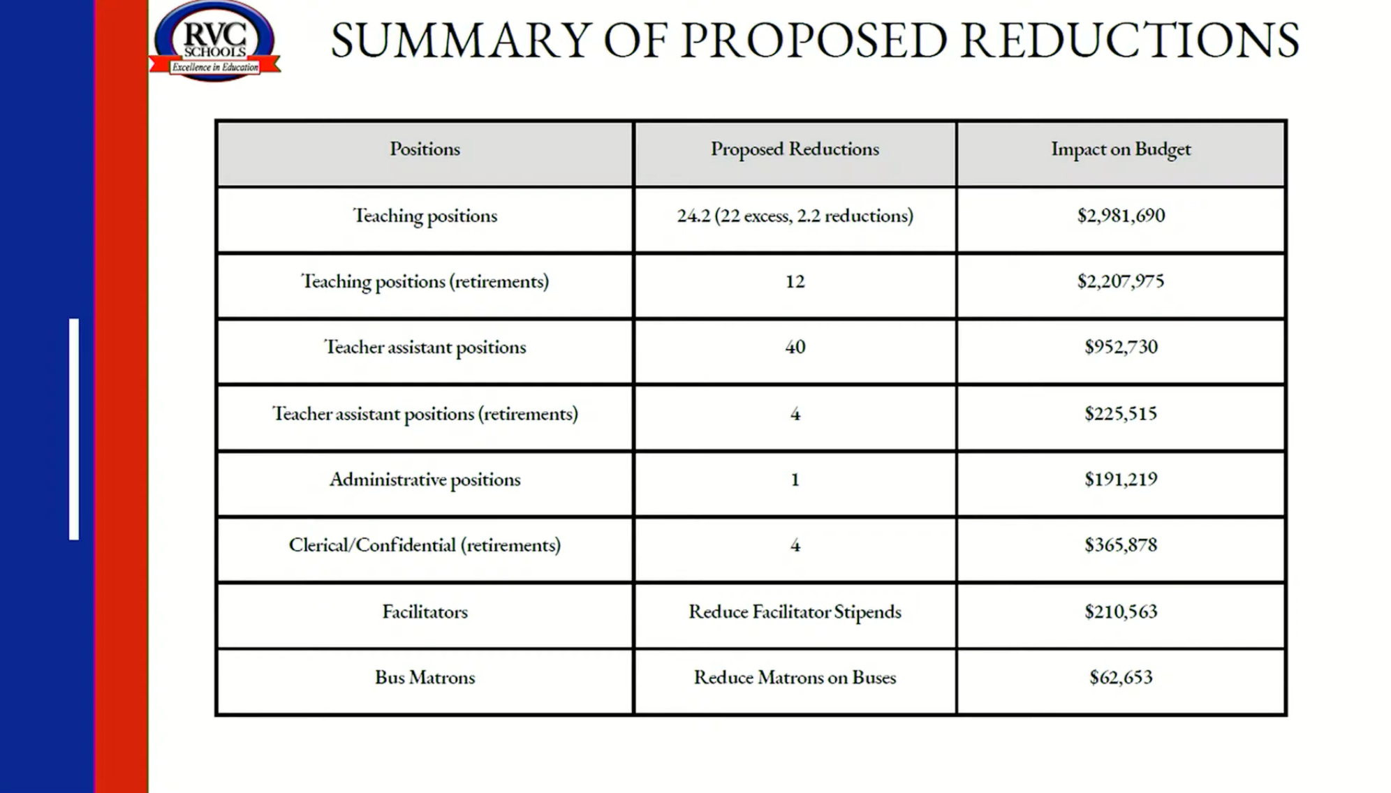 This was the first budget presentation since Mar. 12, when the administration had proposed a budget that would eliminate 24 teaching positions, 40 teaching assistant roles and an assistant principal role at the high school. After community and BOE feedback at that meeting, Gaven presented an amended budget proposal Thursday night that still featured reductions in teaching positions, displayed below: