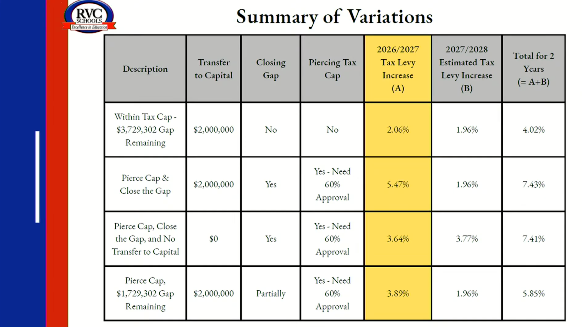 Another sample budget Rehak presented included a combination of measures, wherein the board could pierce the tax cap to a lesser extent and close $2 million of its $3.78 million budget gap and make up the rest by cutting spending elsewhere. In that scenario, Rehak said, the tax would increase by 3.89 percent, meaning the board would still require a supermajority to pass its budget. In that scenario, taxes would increase by 5.85 percent over two years.