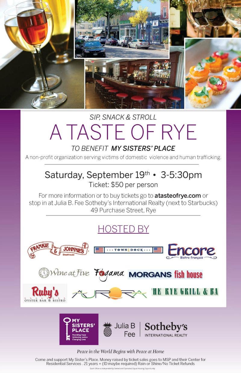 Julia B. Fee Sotheby’s International Realty announced today that the company will partner with My Sisters’ Place, a Westchester County-based organization that works to fight domestic violence, in hosting a fund-raising “A Taste of Rye” restaurant crawl on September 19, 2015 from 3-5:30pm. The company participated in a similar event last fall and raised over $30,000.
