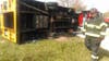 The car went onto the lawn of a home and struck a fence, while the bus continued eastbound and struck a curb at the same residence and tipped over, police said.