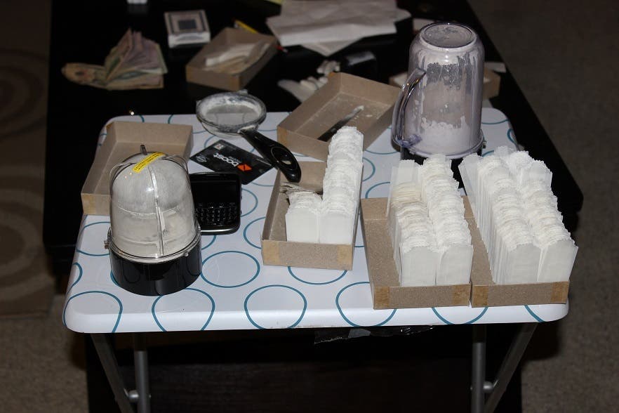 Photo (courtesy of the Suffolk DA’s Office): A drug workstation found in a Brentwood home.