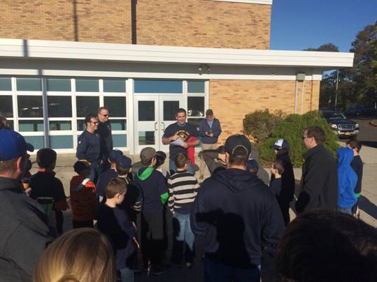 Photo courtesy of the office of Bill Lindsay III: Holbrook Chamber President Rick Ammirati, Legis. Lindsay III, and Pack 124 Leader Mark Guerello address members of Boy Scout Troop Pack 124 and volunteers before the start of the Clean-Up.