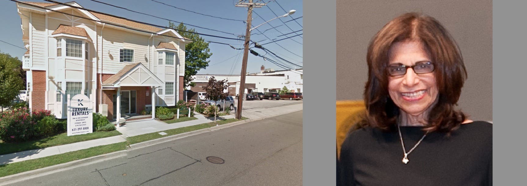 Photos (left- Google Maps, right- courtesy of Farmingdale State College): The decapitated body of Patricia Ward was found in the road outside a Farmingdale apartment building on Tuesday night.