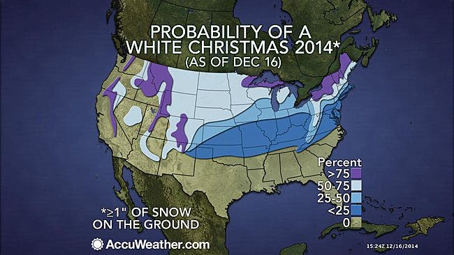 According to the above map from AccuWeather.com, the best chance for a white Christmas this year will be well north and west of the island.