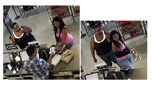 The first suspect is described as a black female in her mid to late 20s, with curly shoulder length black hair. She was wearing a pink tank top, jeans and her right arm was in a black sling. The second suspect is described as black, heavy-set, in her 30s, with black hair. She was wearing glasses, a dark top and jeans.