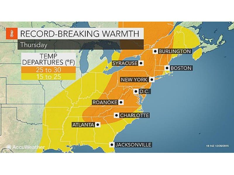 The rest of the East Coast is expecting similar, record-setting temperatures this holiday. “The only chance of a white Christmas will be in the Tug Hill region of New York state, east of Lake Ontario, and northern Maine,” writes AccuWeather meteorologist Kristina Pydynowski.