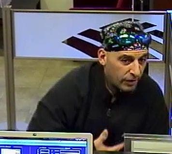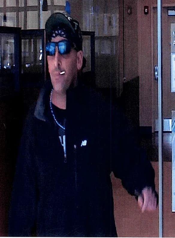 The robber was wearing jeans with white sneakers, sunglasses and a dark blue and white bandanna under a New York Jets baseball hat.