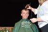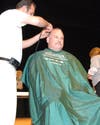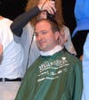 East football coach Brian Harvey had his head shaved with a buzzer on stage, but waited for Ahearn to arrive and finish the job by trimming the remaining fuzz down to the scalp.