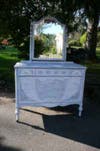 This antique French dresser with connecting mirror is one-of-a-kind. The owner Sknobs. The mirror is also detachable. For dimensions, click the link above. This dresser costs $595.
