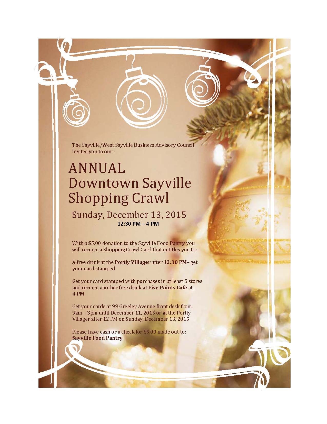 The Annual Holiday Shopping Crawl in Sayville IS for a WORTHY CAUSE---the Sayville Food Pantry: Save Sunday, December 13: 12:30 to 4 pm