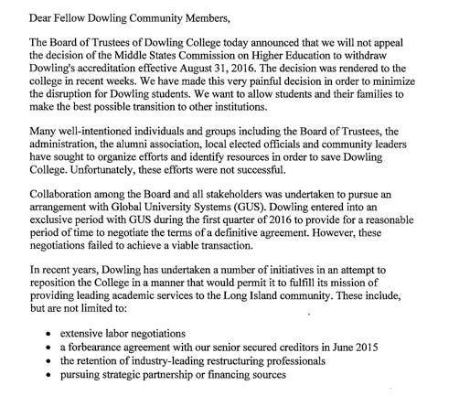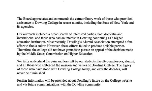 Efforts to save Long Island's Dowling College from closure have failed and the school's board of trustees will not appeal a decision by the the Middle States Commission on Higher Education revoking the college's accreditation, the board announced Wednesday.