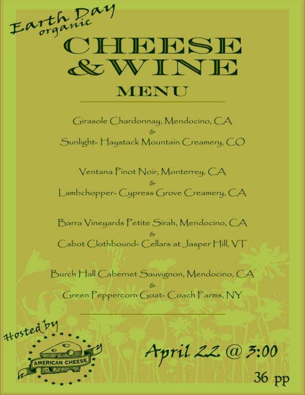 Earth Day organic cheese and wine pairing hosted by American Cheese.