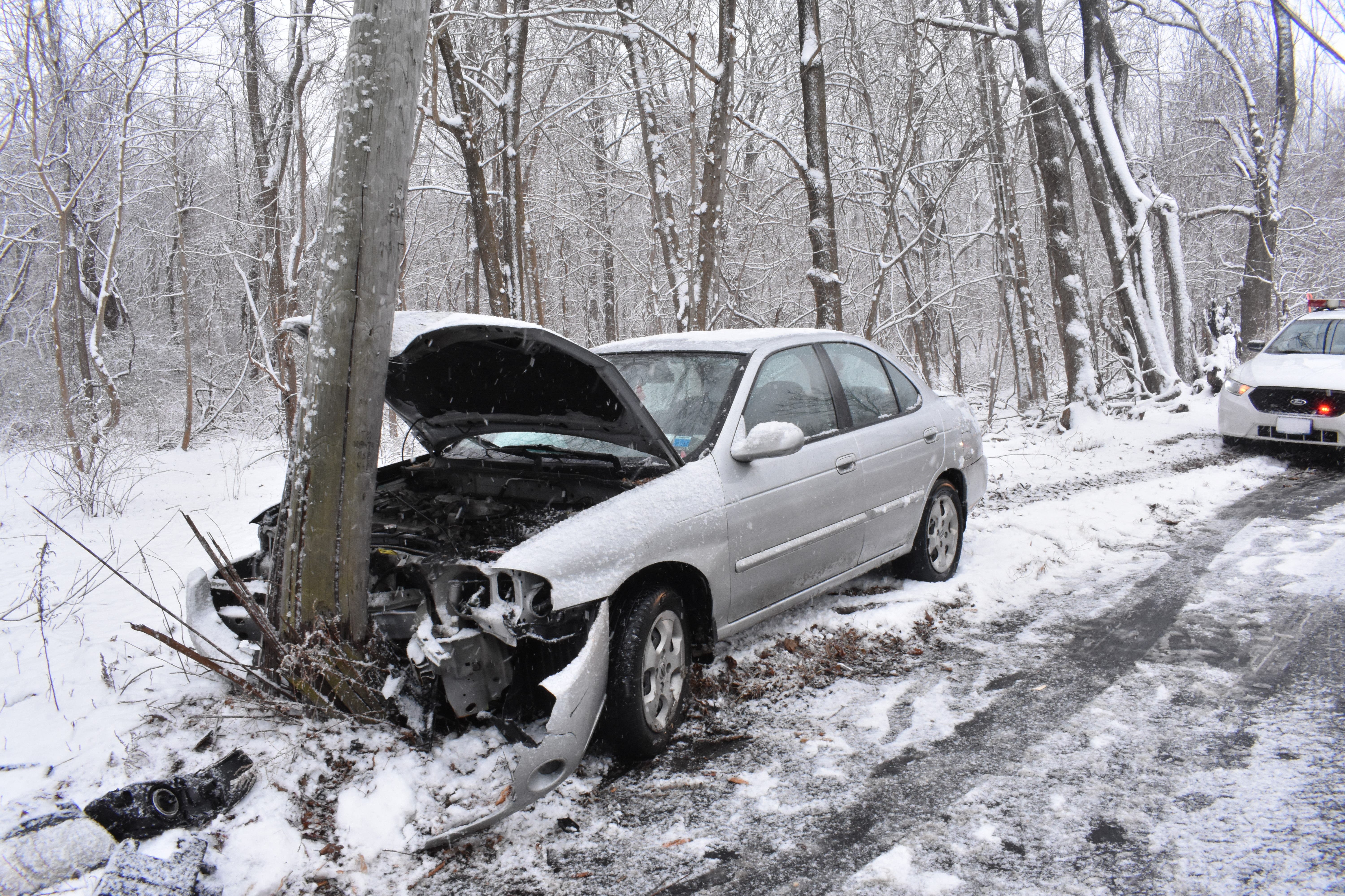 A car crashed into a tree on Sunken Meadow Road in Kings Park Tuesday afternoon. (Photo by Evan Rolla)