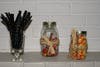Get the big pillar candles in off white or vanilla. Place them on a mantel inside hurricane holders or on a plate surrounded by pine cones and acorns (which should be removed if you light the candles). Candy like M&M's and Hershey's Kisses come in fall colors this time of year so they are fun to decorate with and look great stored in Mason jars on the kitchen counter, as does candy corn. Wrap a cinnamon stick around the middle of the jar with a piece of twine or raffia for an extra special touch. Or you can put some of the candy in an old clear dessert cup or wine glass and place them on your coffee table in place of a regular candy dish. Try placing a handful of black or chocolate Twizzlers inside a cordial glass or a juice glass standing up.