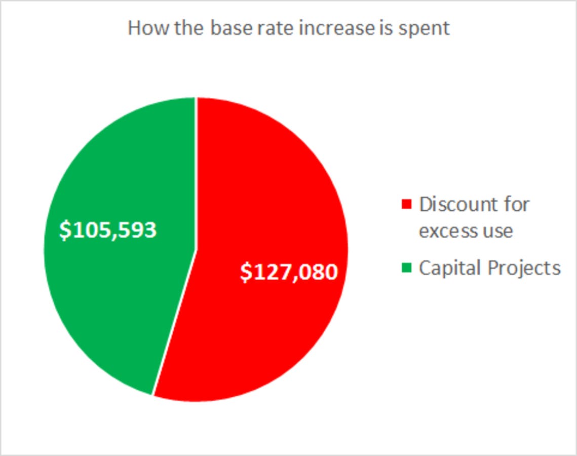 The net effects of a 12.28% increase to the base water rate (1-50 units consumed) and a 3.76% reduction of the excess rate (> 50 units consumed) yields an additional $105,592.65 for water-related capital projects. This calculation was based on residential water consumption for the last four billing periods. However, the cost of the excess rate reduction alone is $127,080.00. Thus, the amount of money awarded to excess water consumers because of the rate reduction is actually GREATER than the amount we are collecting to fund important capital projects.