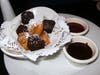 The dessert seemed to almost summarize all the desserts on the menu. It was deep-fried chocolate and banana cakes with raspberry and chocolate dipping sauces.