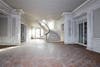 The foyer is a shadow of its former days, but there are hints of its past glory. The herringbone floors are magnificent—dusty, but magnificent. The floating staircase is in terrific condition, and crown moldings are in every room. To the right is the parlor, a welcoming room with fireplace, built-ins and French doors that open out on to what once was a terrace.