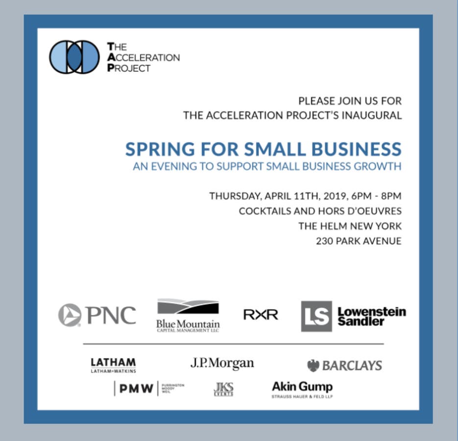 On Thursday, April 11, The Acceleration Project (TAP) will host its inaugural “Spring for Small Business” benefit to support its efforts to fuel small business growth in the New York metropolitan area and beyond. The event will be held at The Helm, 230 Park Avenue, from 6:00 to 8:00 pm, and tickets are $300 per person.