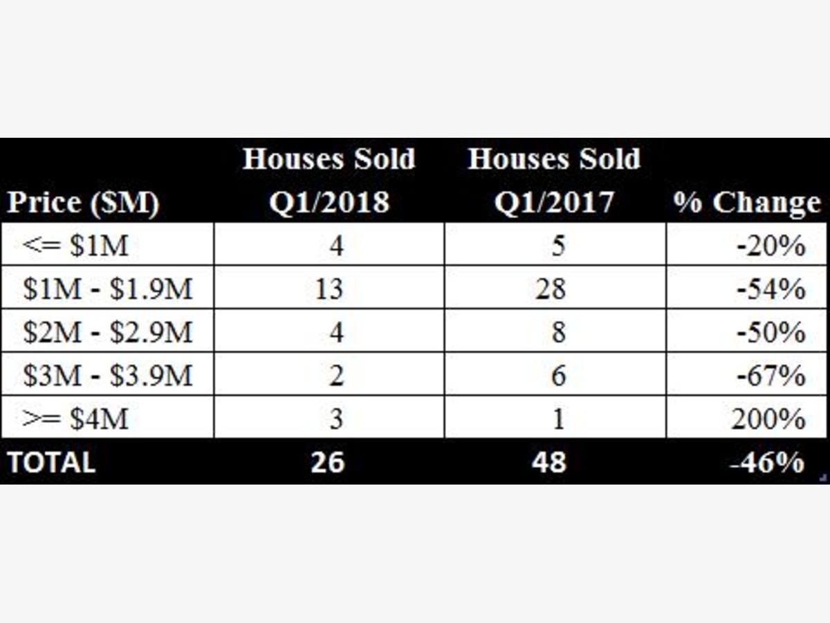 The first quarter 2018 sale prices ranged from a low of $777,500 to a high of $6,750,000 with a median sale price of $1,600,500 and 83 average days on market. Average square footage was 4,583 sq feet and average lot size was .467 acre. Interestingly, the sales over 4M were very high priced at $5,975,000, $6,400,000 and $6,750,000.